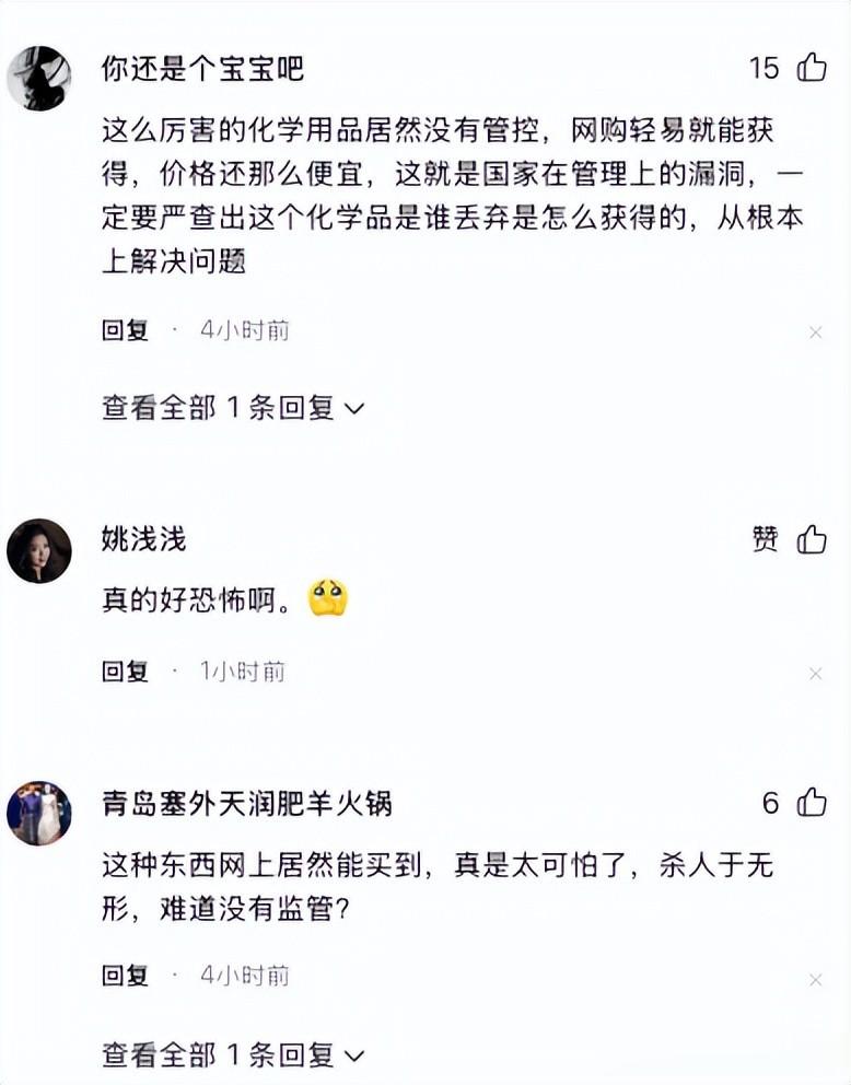 网友看法随着媒体报道,网络上掀起热议。网友们除了惋惜,更愤怒的是:为什么这样的化学品会出现在居民区?是谁丢弃的?谁该承担责任?如果没有彻底追查,以后还会不会有人遇害?
