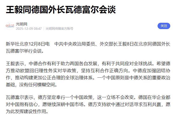 12月8日,德国外长瓦德富尔抵达北京后,向全球明确德国奉行一个中国政策。