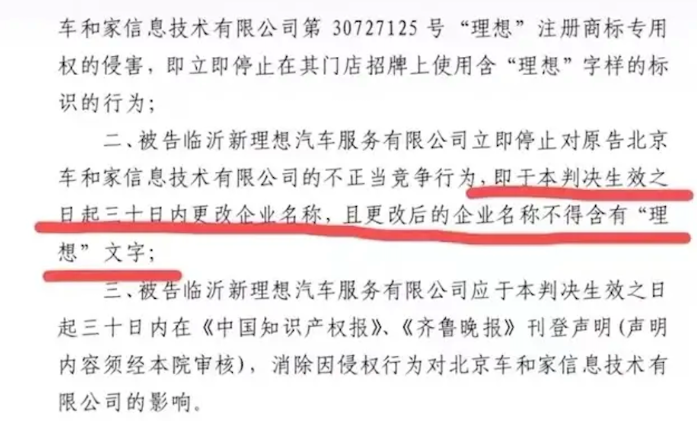 2.立即停止不正当竞争行为,更改企业名称,且更改后的企业名称不得含有“理想”文字