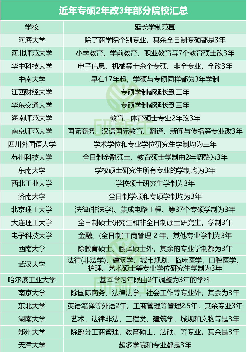 讨论归讨论,缩短学制还不知是啥时候的事,但专硕2年改3年却是当下的事,现在越来越多的学校加入了专硕2年改3年的阵营,现在硕果仅存的2年制院校真的不多了,而且越来越稀缺!