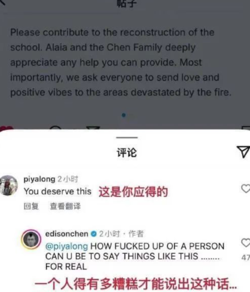2025年01月16日,定居洛杉矶的陈冠希因女儿Alaia就读的学校在火灾中被毁,而在社交平台上发起募捐,希望重建校园。然而,这一善举却引来部分网友的冷嘲热讽,甚至导致陈冠希在Instagram上怒挂素人照片,引发了新一轮的争议。