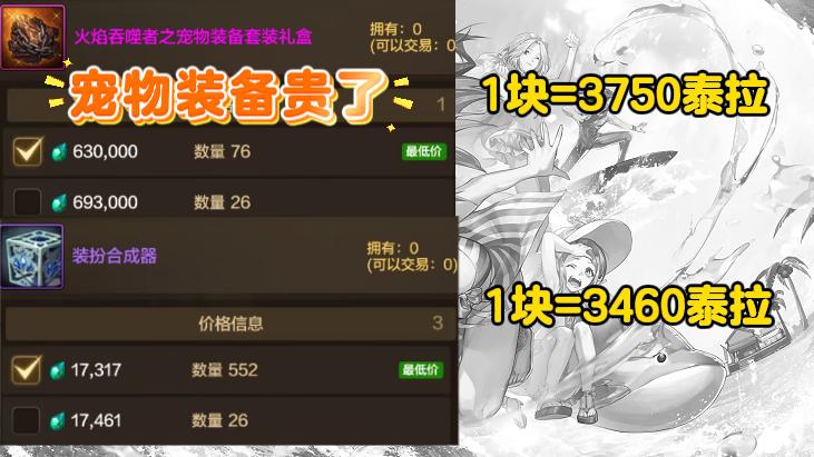 再来对比其它大区,比如某一个Q区,1套安徒恩宠物高达63万泰拉,折合1块能换3750泰拉,再来看装扮合成器,高达1.73万泰拉,那么1块差不多能换到3460泰拉,所以这个大区的安徒恩宠物卖贵了。至于安徒恩宠物则是54万泰拉。