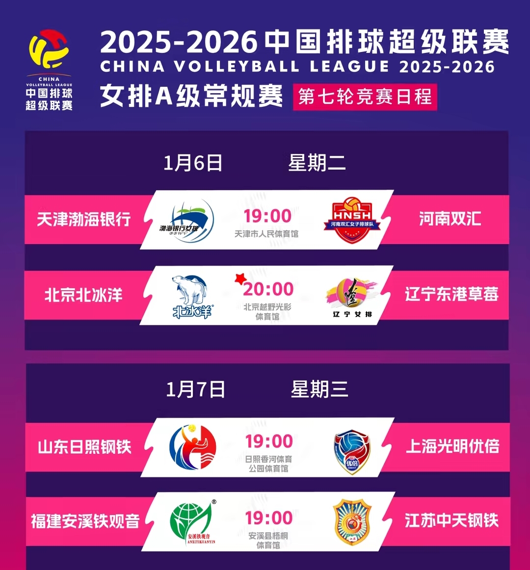 天涯体育排球讯 北京时间1月4号消息,今天是星期一,明天星期二排超联赛第七轮比赛继续进行。