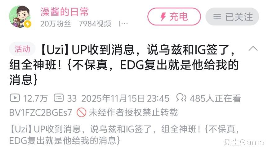 知名乌兹切片UP主澡酱的日常,深夜发视频爆料:收到消息,说乌兹和IG签了,组全神班,不过他还特意注释不保真,爆料内容是上一次,说Uzi要复出,加盟EDG的大粉给他的,所以可信度是有,但到底是不是真的,现在感觉还得打一个问号,但Uzi最近的动作,确实有点不符合常理了。