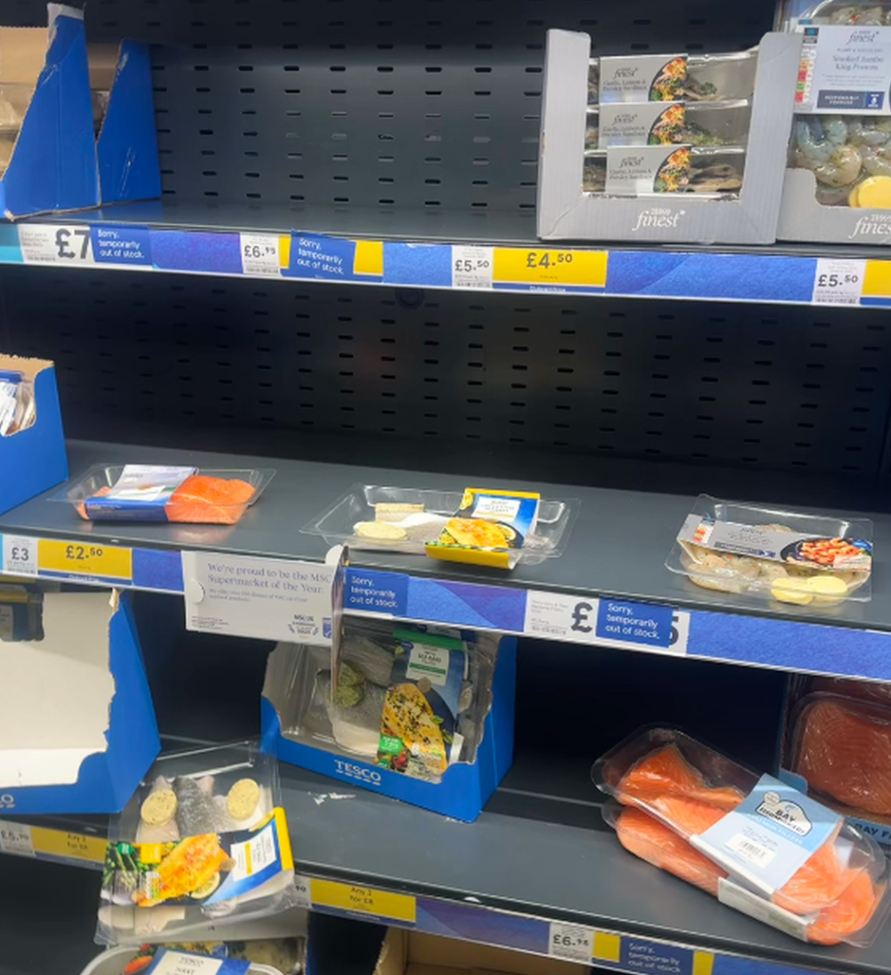 格雷迪暴雪预警一经发出,英国各大超市便率先陷入“抗雪囤货潮”。从伦敦的乐购(Tesco)到格拉斯哥的阿斯达(Asda),近一周社交媒体上流传的实拍视频显示,货架前挤满了神色匆忙的民众,购物车被塞得满满当当,除了常规的饮用水、罐头、主食,除雪盐、保暖衣物、应急电源等抗雪物资更成为最抢手的目标。有网友1月3日发布的视频中,原本摆满意大利面、速冻食品的货架转眼变得空空荡荡,部分区域甚至出现了短暂的拥挤推搡,工作人员不得不加紧补货,却依旧跟不上抢购节奏。