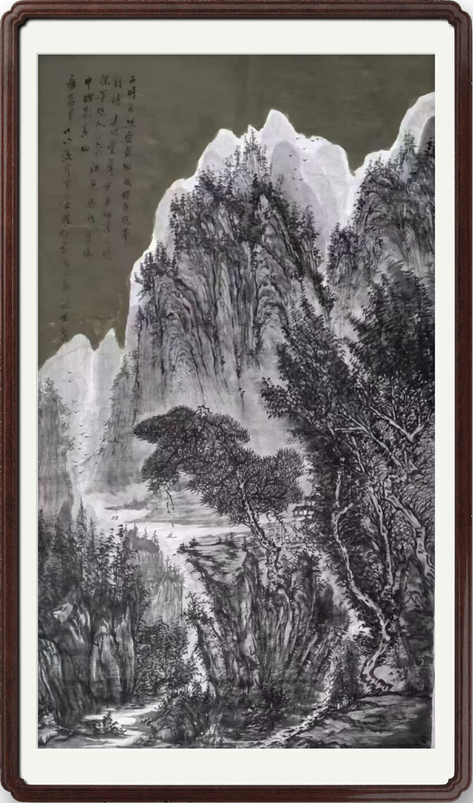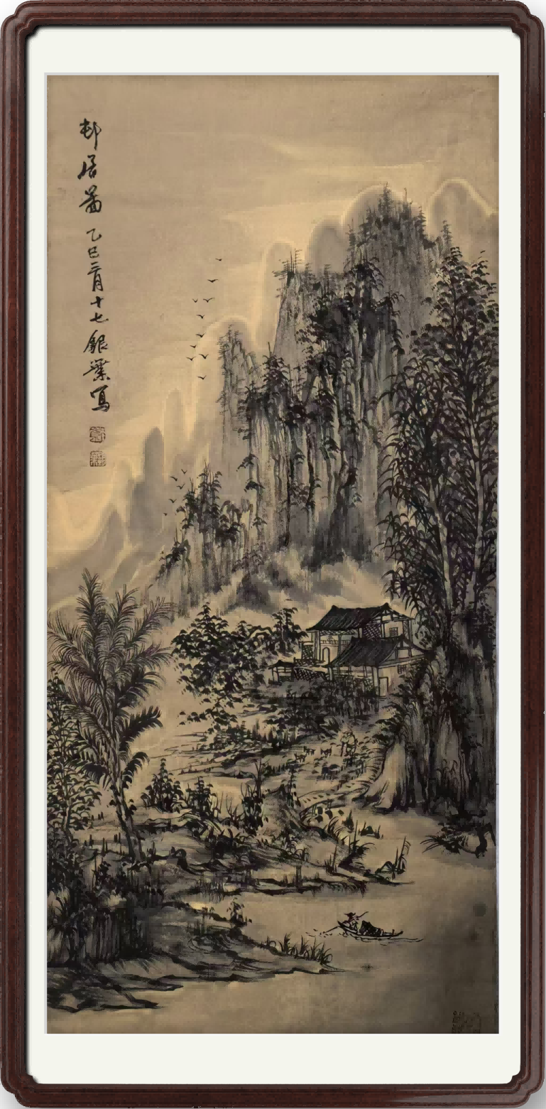 刘银叶始终用故园山水来表达他隐逸思想的核心主题,湘中山地“层峦叠嶂藏村落”的地理特征,常在他笔下渲染得宁静而旷逸,营造成超脱世俗的精神栖居地,如《翠山苍松林居图》中,焦墨勾皴的山石与淡墨晕染的远峰形成虚实对比,密匝的松林间隐约可见茅舍小径,暗含“结庐在人境,而无车马喧”的隐逸理想。 《故园秋》中“云气结晶勤布雨,阴阳合妙多生虹”的题诗,暗喻画家对喧嚣尘世的疏离与对自然本真的向往。