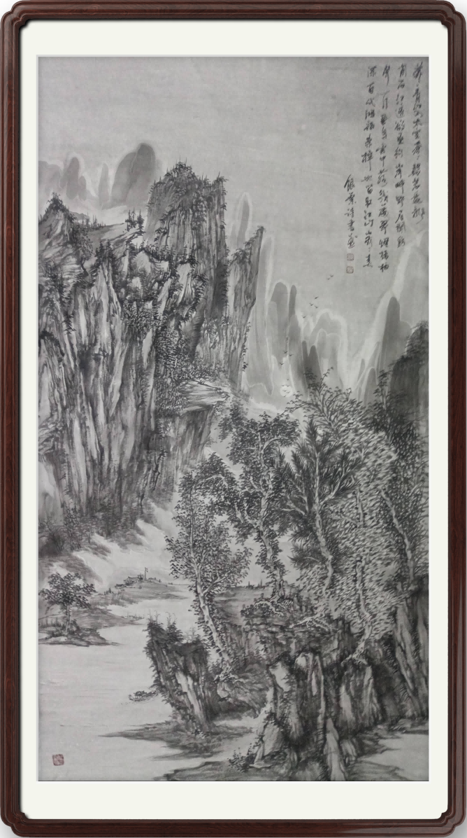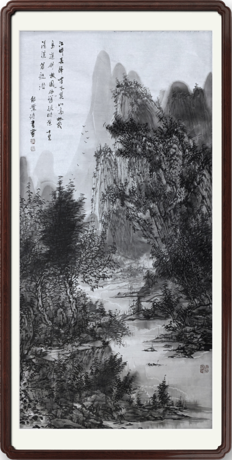 作为湖南新化人,他的创作始终根植于湘中腹地山水的灵感,故乡的风土人情,地理风貌,地域景观都成为了其作品的意象。古台山与紫鹊界的翠峰丛叠的韵律、资江两岸的浩渺烟波、大熊山的古寺与林泉,都在他的笔下提炼成为表达故土情怀的写意或象征性的视觉符号。例如《资滨清晓图》以资江晨雾为背景,通过淡墨皴染与焦墨勾皴的对比,再现了江水的蜿蜒清冽,赋予了画面“云根结,山郭浮”的诗意。是对故土地貌的凝练表达。故土的自然景致转化成了可以传承的文化记忆,更是他对故土情怀的深情表达。
