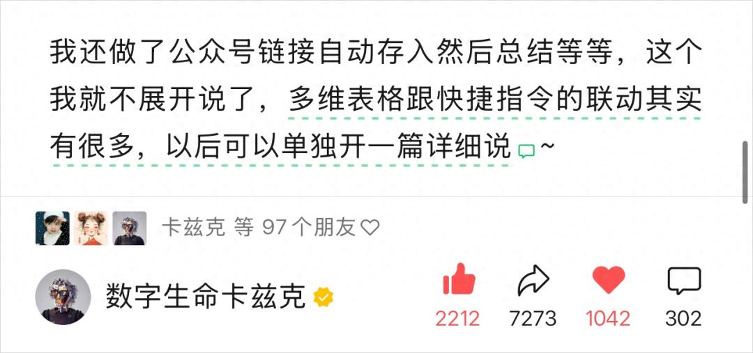 当然还有 快捷指令+多维表格+工作流的结合,跟爬虫的结合,等等等等。