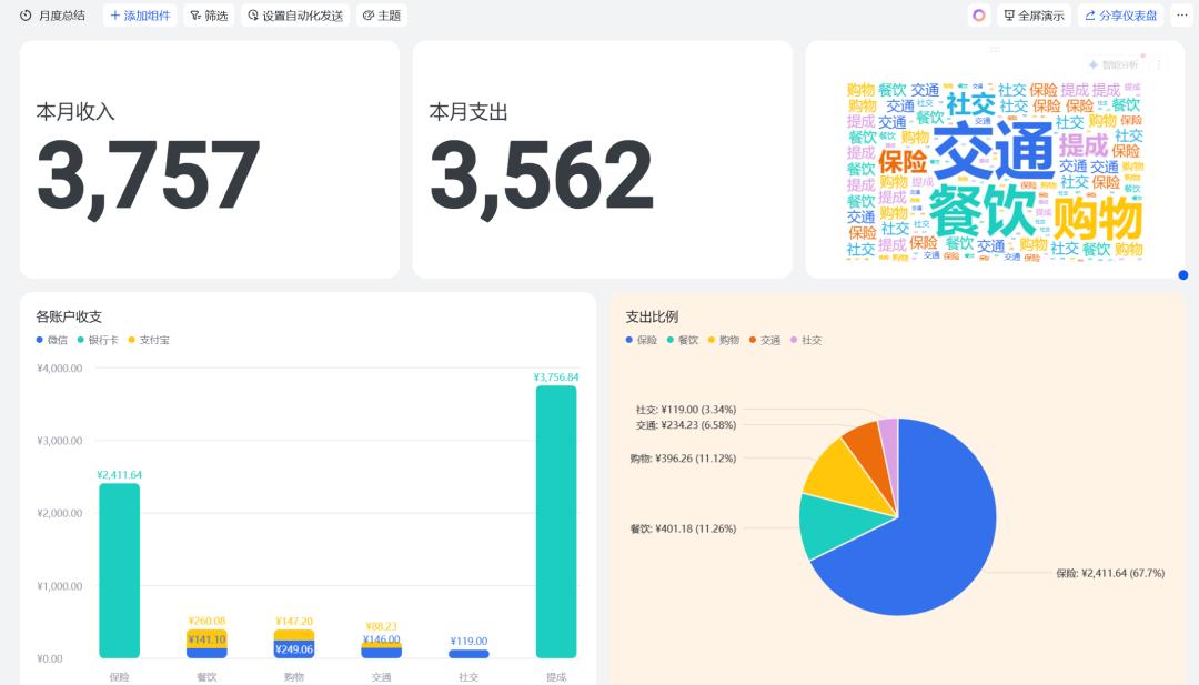 接下来,我还可以通过飞书多维表格的仪表盘去做数据可视化,在表格里记录一笔钱,就自动同步到仪表盘里。