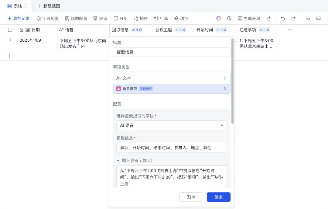 我可以说一句行程,然后把这句话自动录入到多维表格里。