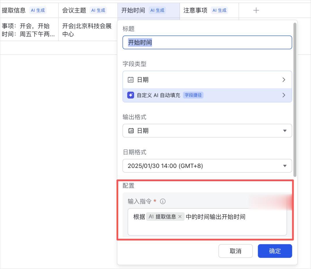 然后,日程内容同步到多维表格之后,还是跟第一步一样,先用一个AI字段捷径,把信息做整合加工,提取出来。