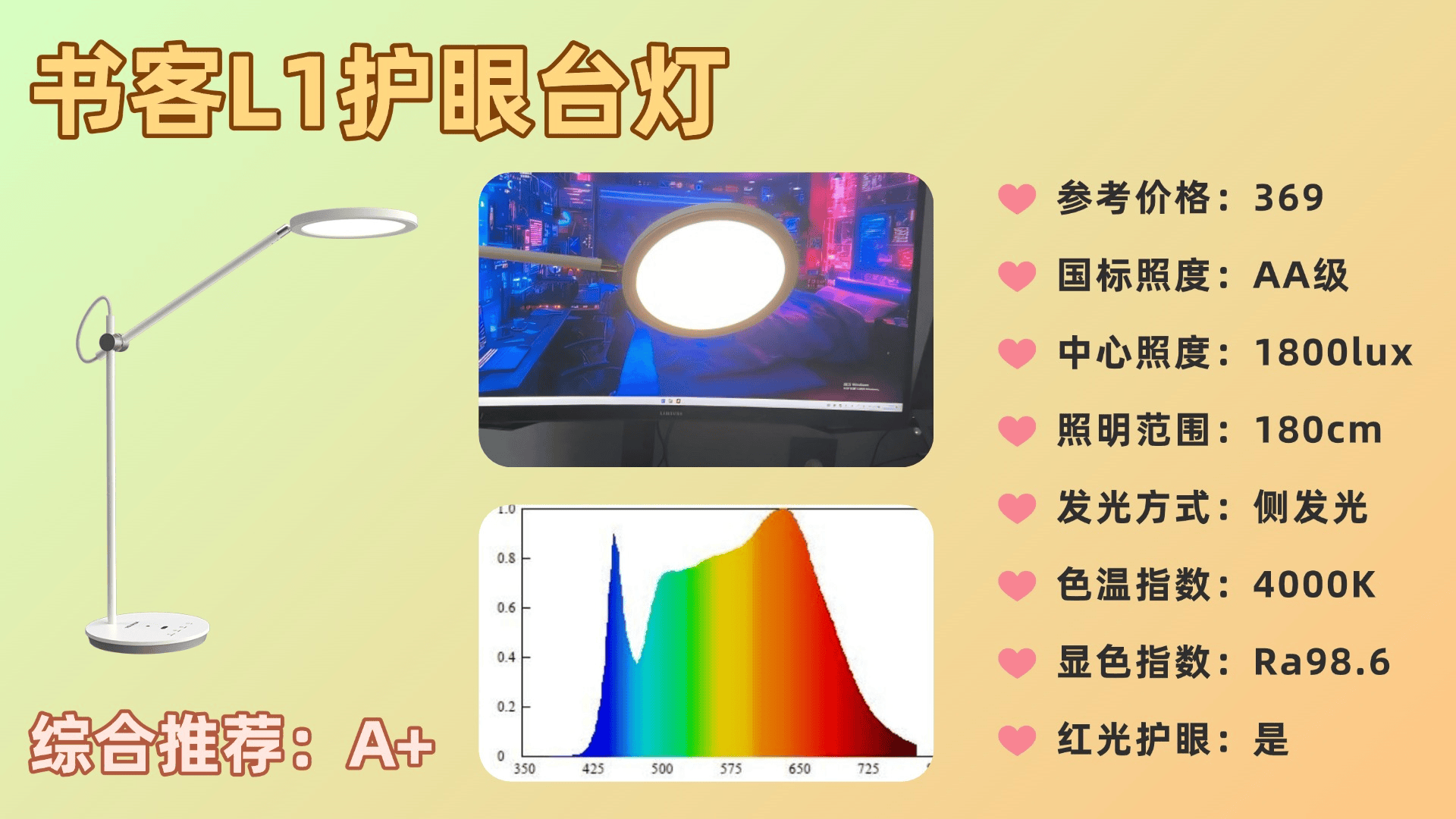 一句话推荐:采用侧发光设计,结合导光板实现多次折射,光线均匀柔和