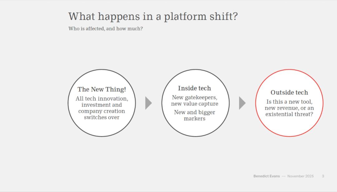 报告开篇便抛出一个核心论断:我们正在经历又一次平台转移。Evans 指出,科技产业大约每十到十五年就会经历一次这样的巨变,从大型主机到个人电脑,从万维网到智能手机,每一次转移都重塑了整个行业的格局。而生成式人工智能,可能正是这个十五年周期中的下一个主角。但问题在于,就像历史上每一次平台转移一样,我们现在对它将如何展开依然充满不确定性。