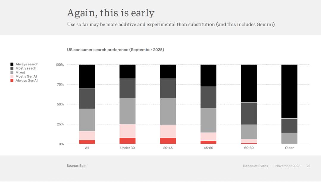 然而消费者行为数据显示,这种拆分还处于早期阶段。Bain 在二零二五年九月的调查显示,虽然年轻群体使用生成式 AI 的比例更高,但总体而言,绝大多数人仍然主要或总是使用传统搜索引擎,而不是 AI 聊天机器人。这包括使用 Google Gemini 的人,其本身就集成在 Chrome 浏览器中,但用户仍然更倾向于传统搜索框。这是早期阶段的正常现象,还是说明了更深层的问题?