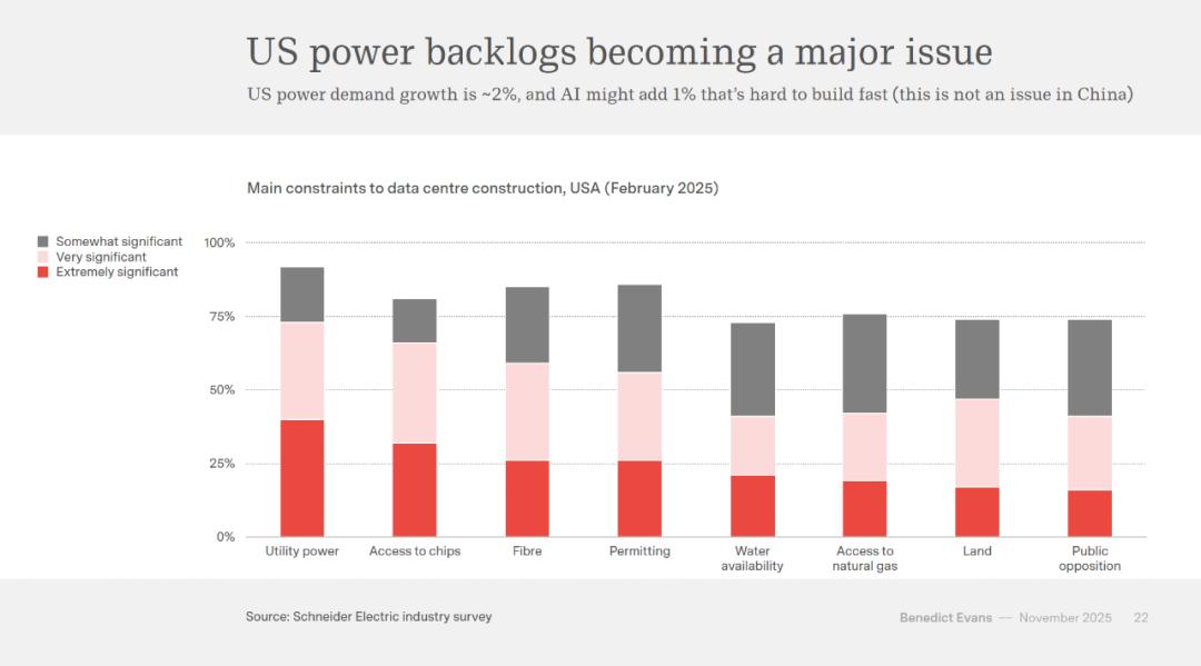 这些钱都流向了哪里?数据中心建设成为最重要的去处。根据美国人口普查局的数据,美国数据中心的建设价值(不包括服务器本身)已经超过了办公楼,这在历史上还是第一次。Evans 引用 Schneider Electric 在二零二五年二月的行业调查显示,电力供应已成为美国数据中心建设的首要制约因素,超过了芯片获取、光纤接入和土地供应。美国的电力需求增长率约为每年百分之二,而人工智能可能额外增加百分之一的需求,这在短期内很难快速建设。报告特别指出,这在中国不是问题,但在美国已成为重大瓶颈。