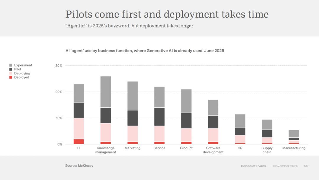 咨询和软件服务公司成为企业 AI 部署的重要推手。埃森哲(Accenture)报告的新生成式 AI 合同金额从二零二三年二月的几乎为零,增长到二零二五年八月的超过十八亿美元。Palantir 这家曾经神秘的数据分析公司,其企业部门收入在二零二五年达到了前所未有的增长,部分归因于其 AI 平台产品。但 McKinsey 在二零二五年的调查显示,在已经使用生成式 AI 的企业中,按业务功能划分,真正“已部署”的比例普遍低于百分之五,大多数仍处于“试点”或“实验”阶段。