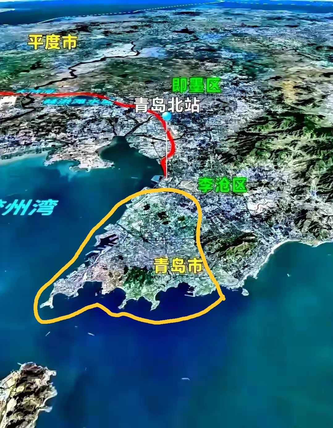 这样一来,问题来了:胶州湾虽然不太大,但是若想让一座城市给包进去,那就显得太大了。毕竟胶州湾绕湾一周约200公里、面积约370平方公里,哪里有这么大体量的城市啊?