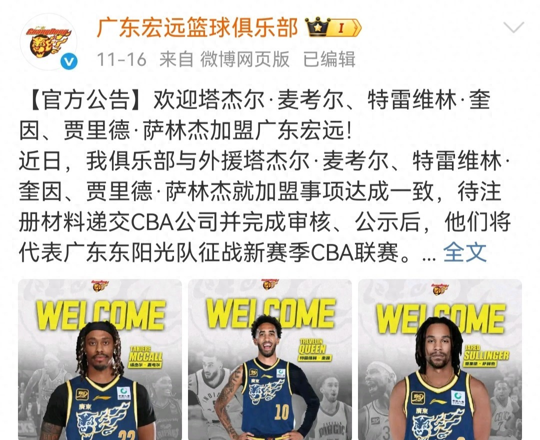 广东男篮今年休赛期阵容变化极大,先是放弃了上赛季效力球队的所有四名外援。随后又通过交易,得到了焦泊乔和崔永熙,一举补强了锋线和内线实力。就在11月16日,球队正式官宣了新签三名外援的消息。而球迷最期待的第四外援,也即将抵达球队。