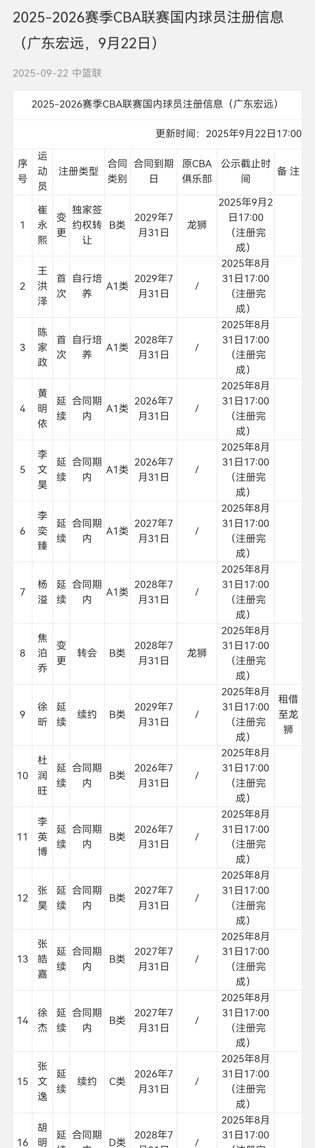 其中徐昕被租借至广洲龙狮,因此广东男篮有国产球员共15人,加上四名外援,广东队新赛季将共有19名球员。