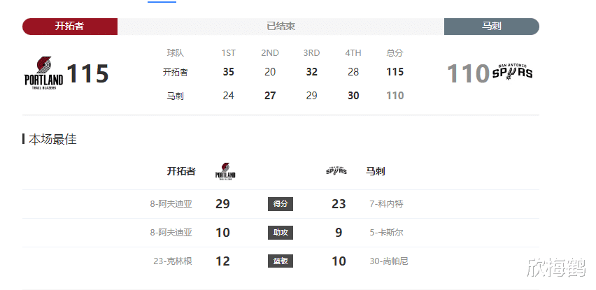 马刺这边科内特23分8篮板5盖帽,尚帕尼20分10篮板,福克斯19分6篮板3抢断,但无奈开拓者三军用命,整体火力太猛!