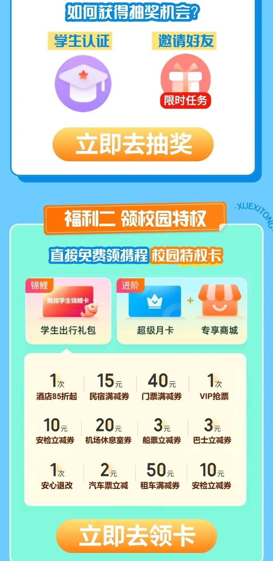 而在秋季开学前后,携程旅行也与学习通合作,学生在活动期完成认证、邀新,不仅可以百分百抽中福利奖品,还能领取校园特权卡片。