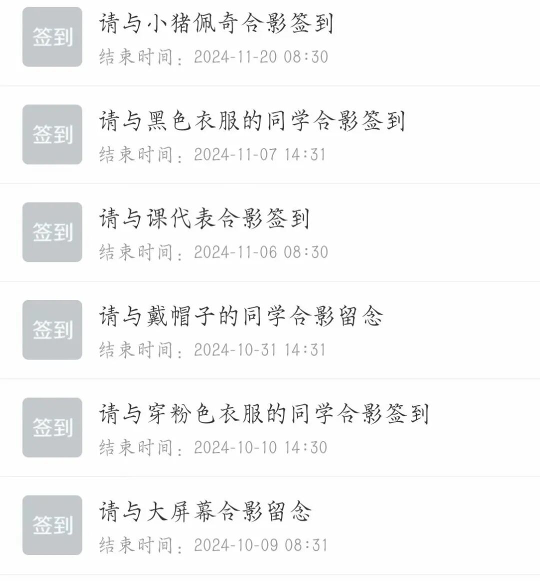 第一式叫作“拍照合影式”,这种招式要求学生签到时,要与特定的人、物拍照合影。