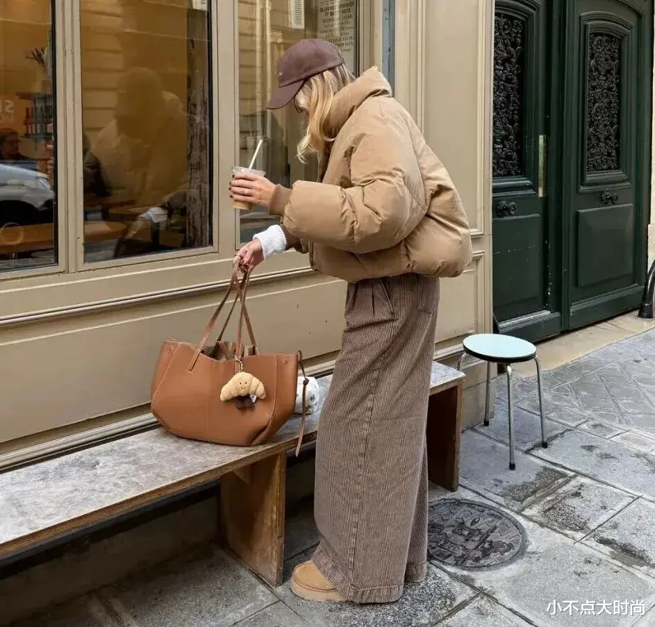 浅棕色的短款羽绒服,搭配同色系的高腰阔腿裤,一整套大地色系的搭配充满冬季的氛围感,温暖低调又舒服耐看。上短下长,保暖又显高,很适合怕冷的矮个子姐妹冬天穿。▼