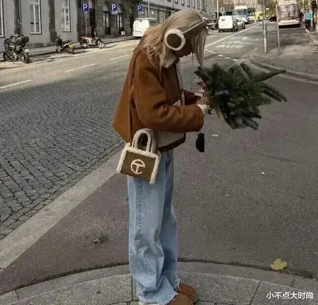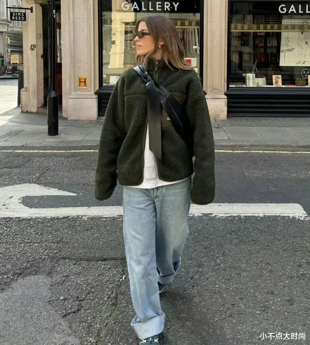 羊羔绒短外套,搭配简约的浅色牛仔阔腿裤,内搭基础款圆领浅色卫衣和白色T恤,一整套简约基础,日常休闲随性风,时尚又耐看。▼