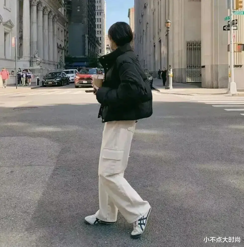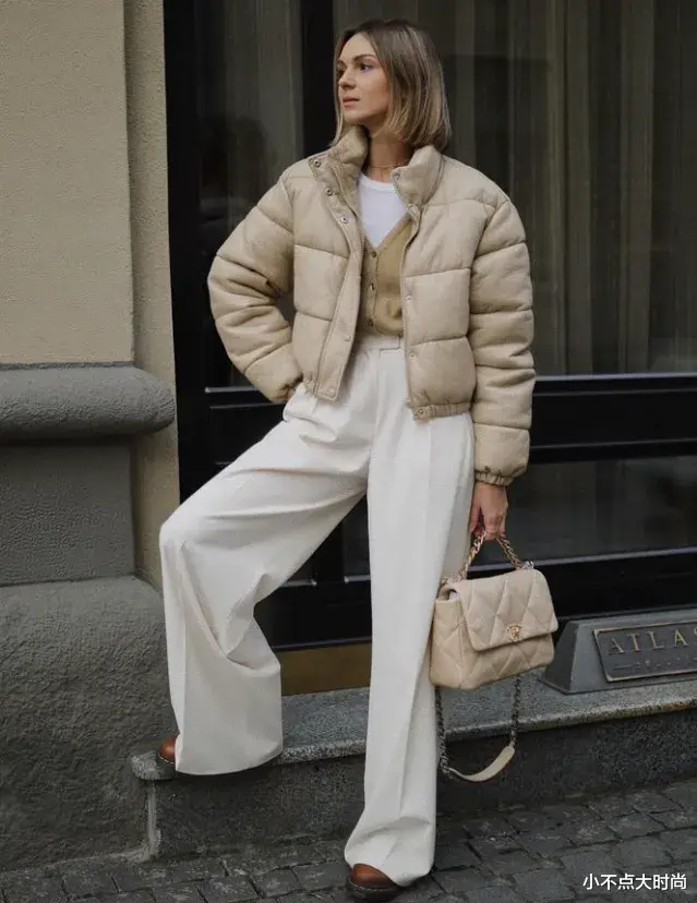 冬天的短款羽绒外套也可以搭配高腰阔腿裤,浅色调的同色系搭配打破一贯的黑色穿搭的沉闷,干净有气质,显高显瘦又舒服温柔,尽显淡淡的高级感。▼