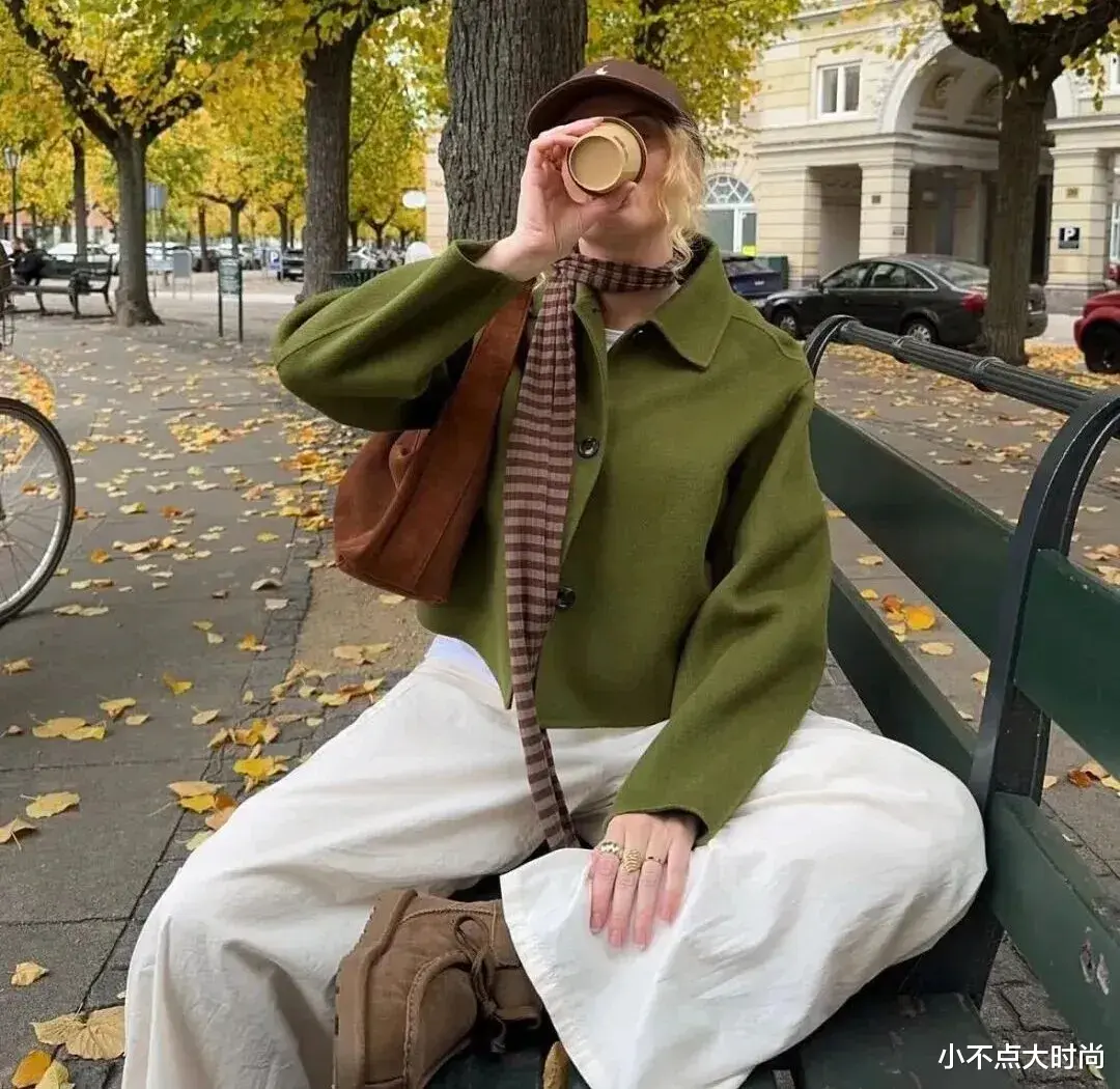 橄榄绿的短款大衣外套,搭配白色的高腰阔腿裤,上短下长显高显瘦。绿色跟白色的搭配温和又有生命力,时髦气质又有秋冬氛围感。▼