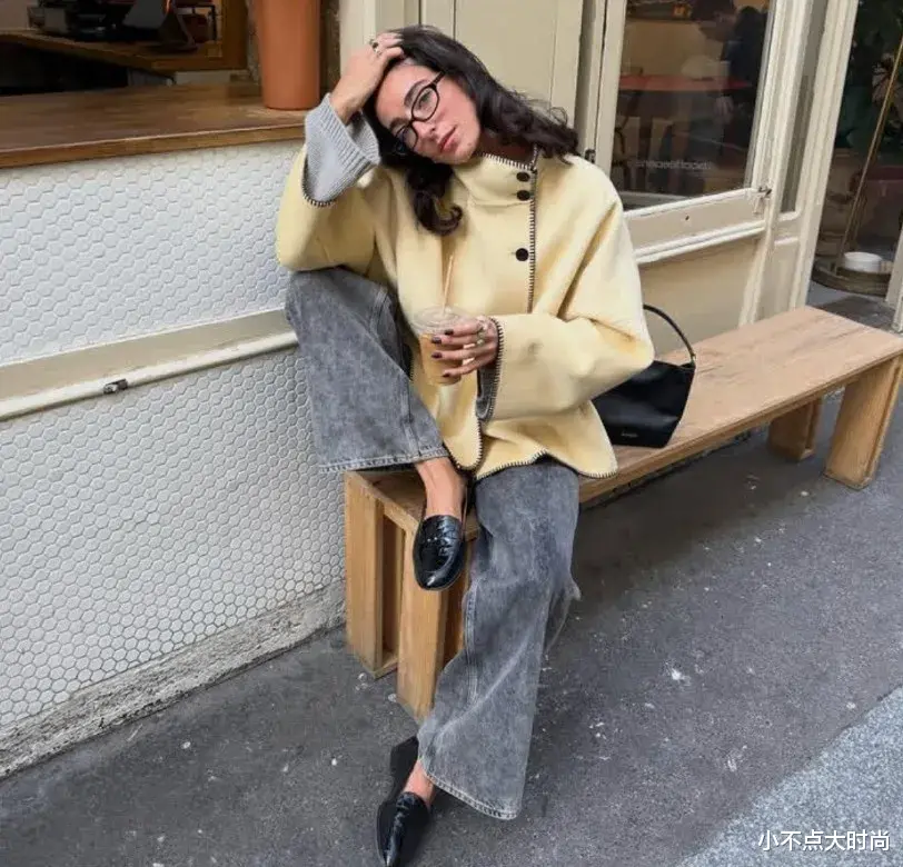 淡淡黄色的短大衣,搭配灰色的牛仔阔腿裤,温柔又有能量的穿搭,显高显瘦,气质满满。▼
