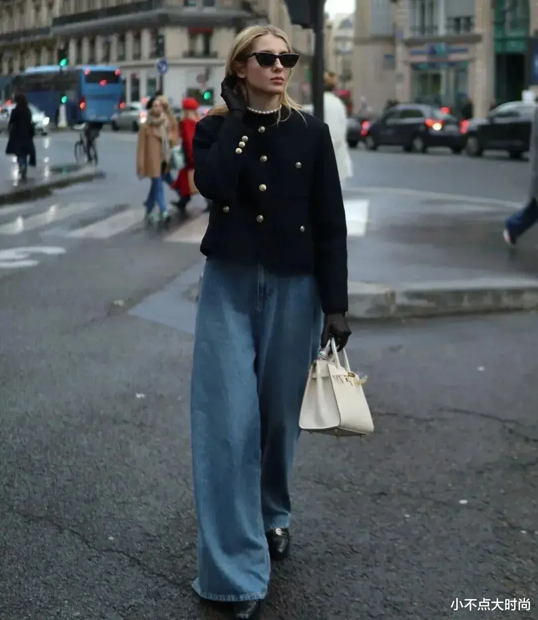 精致贵气的小香风短外套,碰撞休闲感的高腰阔腿牛仔裤,上短下长十足地显高。牛仔裤的随性感中和了小香风的贵气,让搭配更加耐看,时髦又气质。▼