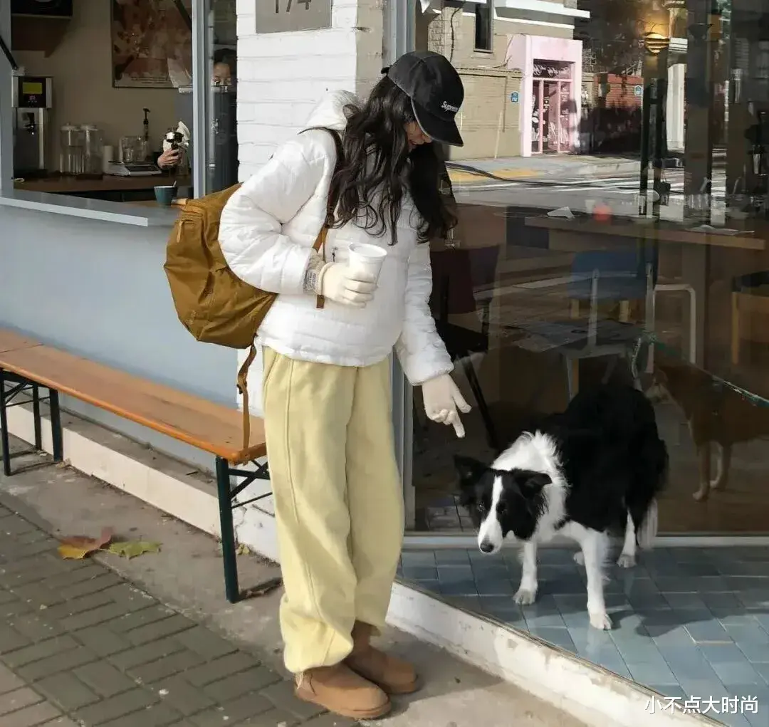 比如白色的排骨羽绒服,搭配低饱和度的黄色阔腿裤,一整套显高显瘦,配色温和又舒服,仿佛秋冬的小暖阳,整套穿搭干净大方,气质又耐看。▼