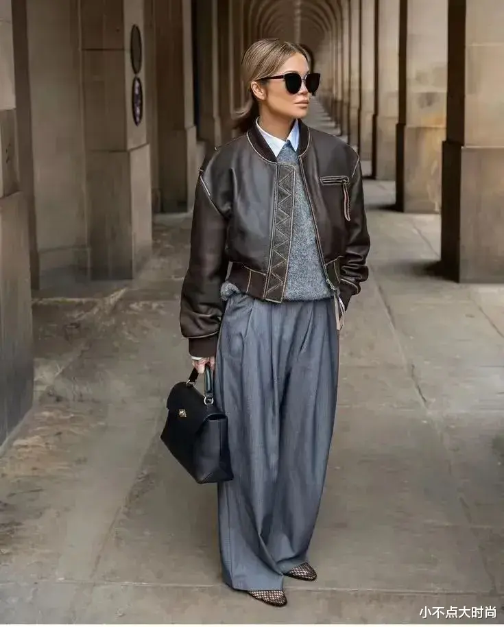酷范十足的短款皮衣外套带有几分复古的腔调,搭配灰色的阔腿西裤,克制又松弛,内搭灰色毛衣叠穿白衬衫,是学院风的清淡时髦,一整套不同风格的碰撞,时尚不违和、富有层次感。▼