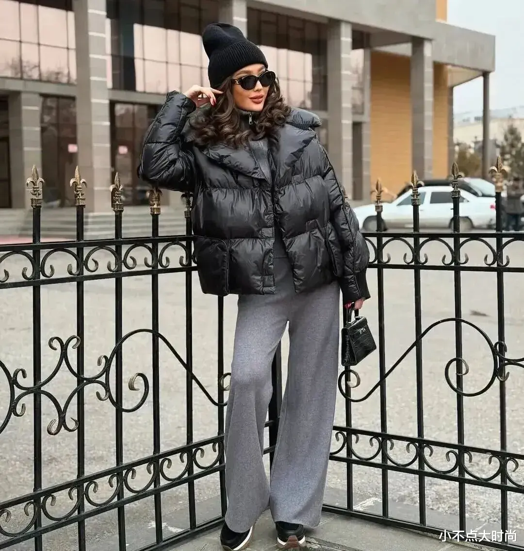 黑色的经典羽绒服,搭配灰色的高腰阔腿西裤,羽绒服的日常感碰撞灰色阔腿裤的克制,尽显时尚。既有利落的气场,又不失随性的自信,简约又高级。▼