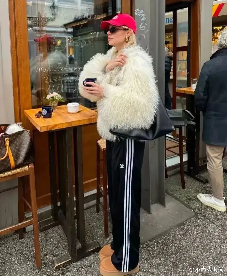 比如贵气温柔的仿皮草浅色短外套,搭配运动风阔腿裤,两个风格迥异的单品进行混搭,更添时尚趣味,阔腿裤的休闲减弱外套的华贵感,让搭配更随和耐看,日常又有品位。▼