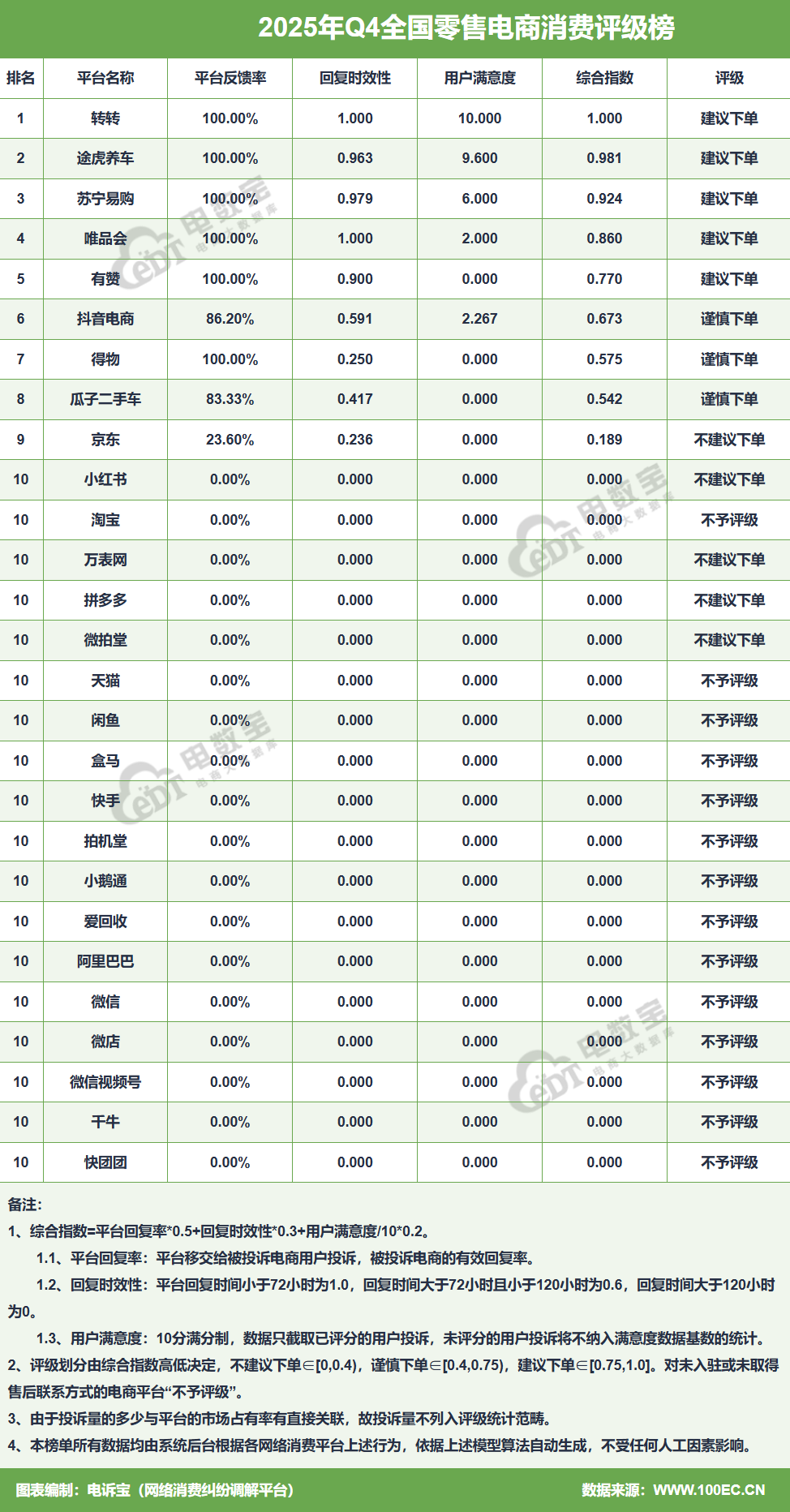 在2025年Q4全国数字零售评级榜中:获“建议下单”的有:转转、途虎养车、苏宁易购、唯品会、有赞;获“谨慎下单”评级的有:抖音电商、瓜子二手车等;获“不建议下单”的有:小红书、万表网、微拍堂等;获“不予评级”的有:淘宝、1688、天猫、闲鱼、盒马、快手、拍机堂、小鹅通、爱回收、阿里巴巴、微信、微店、千牛、快团团等。
