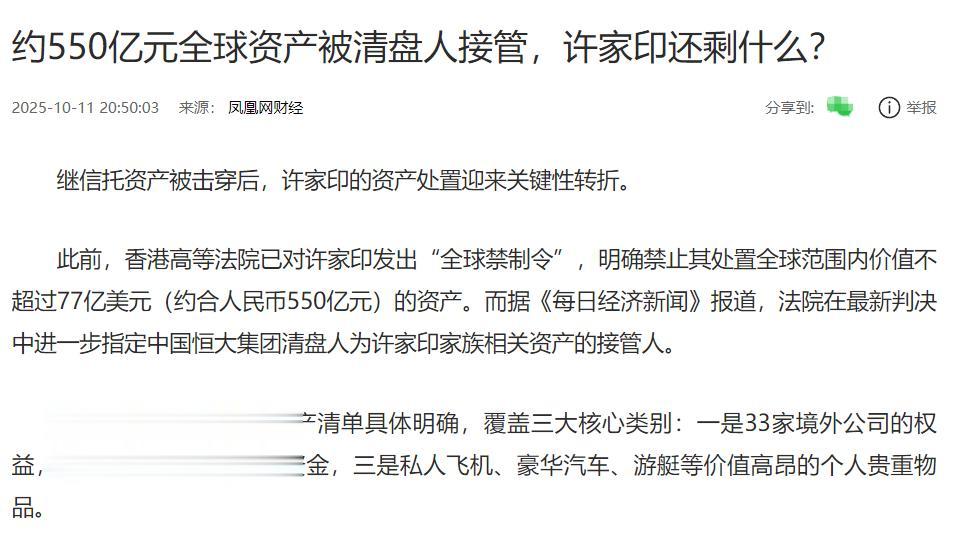 除了丁玉梅,没想到许家印名下也还有大量资产。去年10月,香港法院指定清盘人接管许家印在全球范围内的77亿美元,约合人民币550亿元的资产。包括33家境外公司的权益,7个银行账户资产,以及飞机、豪车、游艇等贵重物品。