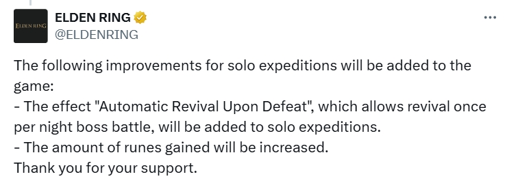FromSoftware官推发布《艾尔登法环:黑夜君临》的更新预告,下周将推出1.02补丁,包含一些修复和调整,单机玩家现在可以在Boss战中复活一次,并获得更多符文,这一设定有利于独狼玩家快速升级和刷装备。