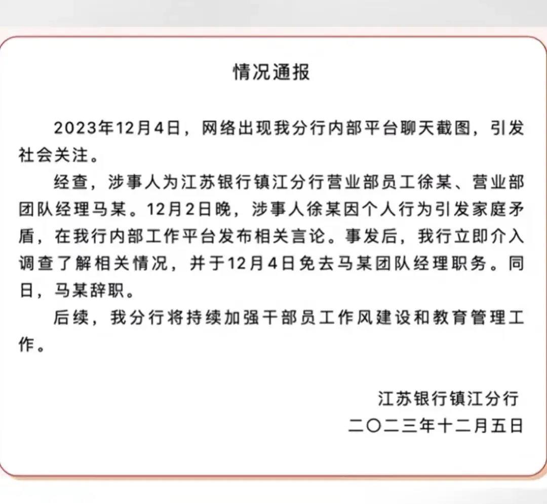 在江苏银行得知此事后,十分重视,立即对马某进行了开免职处理,也许这就是对马某的惩罚了!