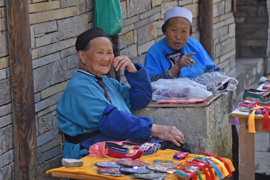 屯堡妇女在服饰方面还保持祖制,宝蓝色的长衣大袖,精致的花边体现了江南刺绣的神韵,一双尖头绣花鞋,透着屯堡妇女的才思,屯堡妇女服饰是研究明代服饰的活资料。仍有很多妇女在街上绣绣花鞋,边绣边买,即有收益也是文化的传承。