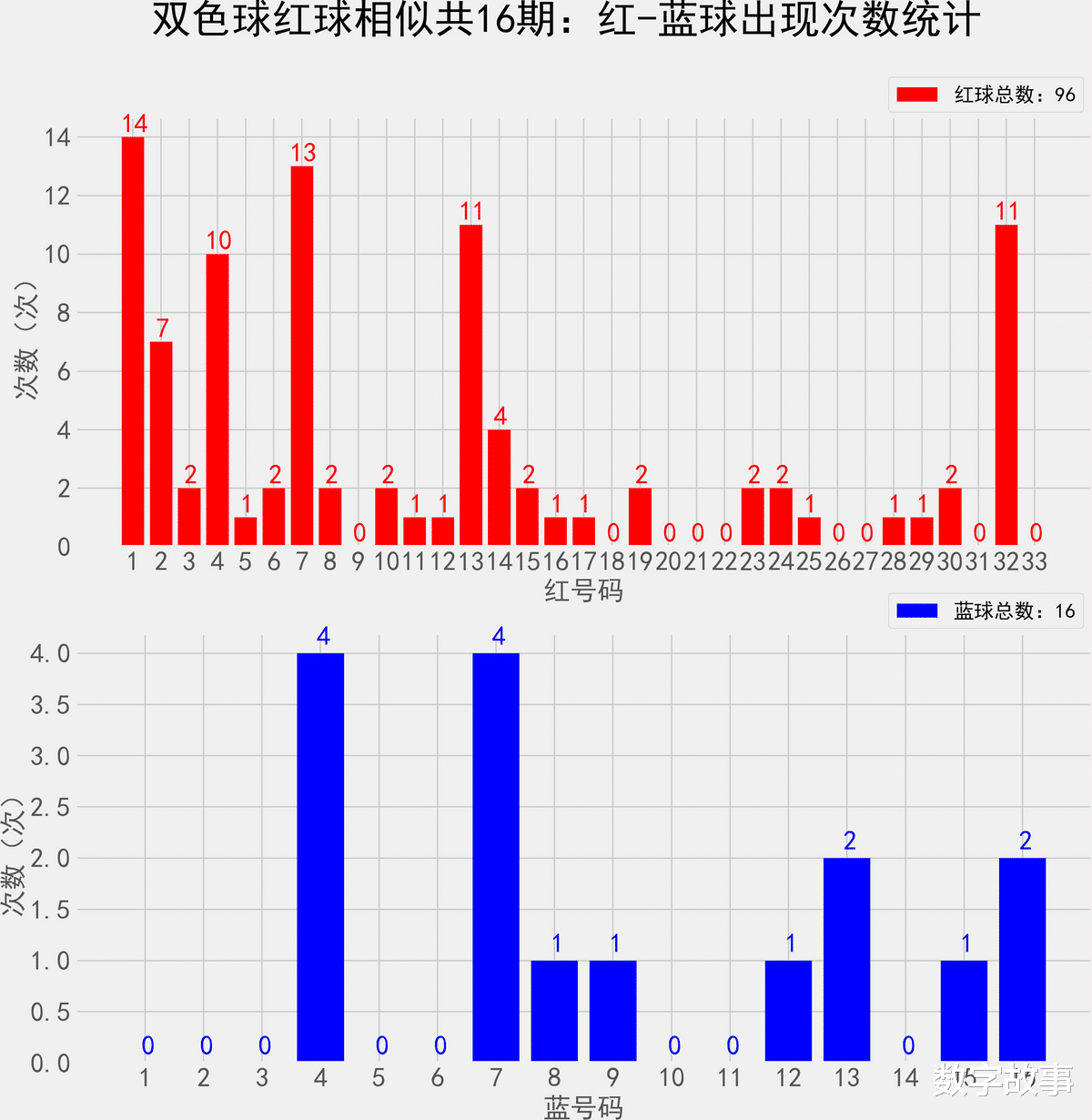双色球近10期红蓝号统计情况统计样本数据: 60个红球 10个蓝球
