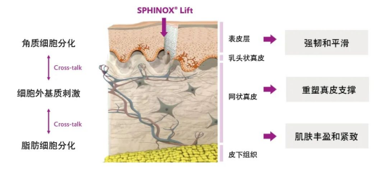 SPHINOX® Lift,就是一款具有独特生物活性的短链神经酰胺。通过基因芯片检测验证,它可以从角质屏障到肌底屏障层层深入,调控皮肤多层抗衰老因子的增强表达,从而为松弛的皮肤增加紧致度和张力、减少皱纹出现、提升面部轮廓,助力打造丰盈紧致的肌肤。SPHINOX Lift在进入皮肤之后,能作为一个信号,刺激角质形成细胞分化,让皮肤外表平滑细腻,同时还能增强各层皮肤细胞之间的“交流”,巩固真皮层细胞外基质和脂肪细胞基质。