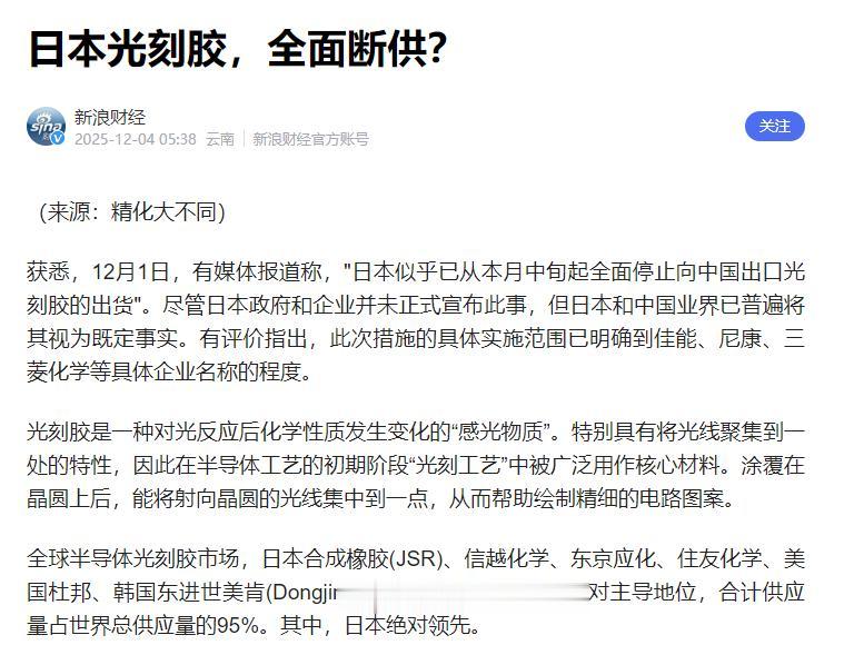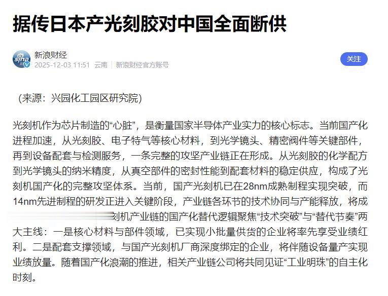 日本的报复开始?高市早苗准备下达禁令,不许卖光刻胶给中国,但最后倒霉的是谁,还真说不准呢。