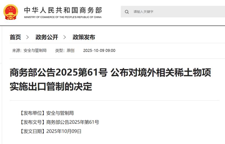 2025年10月,商务部公告对稀土相关物项实施严格出口管制,覆盖原生稀土及含中国稀土的加工产品。