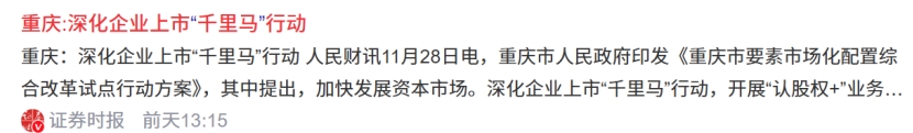 重庆:深化企业上市“千里马”行动, 开展“认股权+”业务模式创新,推动上市公司并购重组和再融资。