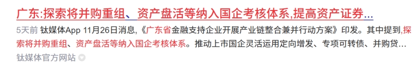 广东:探索将并购重组、资产盘活等纳入国企考核体系 提高资产证券化水平。