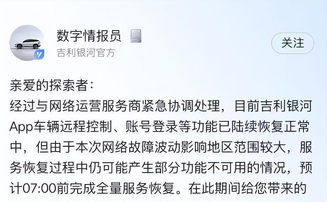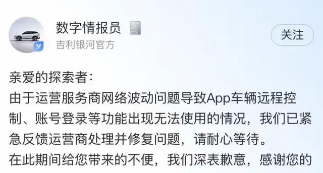 吉利银河APP的两次故障,犹如清晨的闹钟,敲醒了人们对智能汽车服务稳定性的重要性认识。5月13日,因运营服务商网络的波动,吉利银河APP的远程车控与账号登录等核心功能遭到瘫痪,许多车主因此被困车外。一个原本便捷的“数字钥匙”,一瞬间变成了让人焦虑的噩梦。而在4月29日,云服务器的异常波动同样导致了APP功能失效。不同形式的“瘫痪”,却让用户体验如坠冰窖。