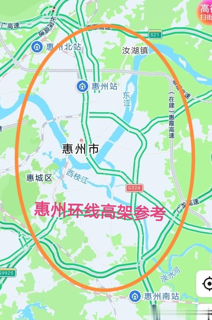 可以考虑在惠城区建设一条完全免费的高架环线,打通重要枢纽,比如惠州北站、惠州南站、西湖,甚至可以将惠环或仲恺纳入规划,合理设计环线走向。这条环线宜采用高架模式,尽量减少对地下资源的占用。要合理设置,将主干道、重要节点以及易堵黑点的车流进行分流。