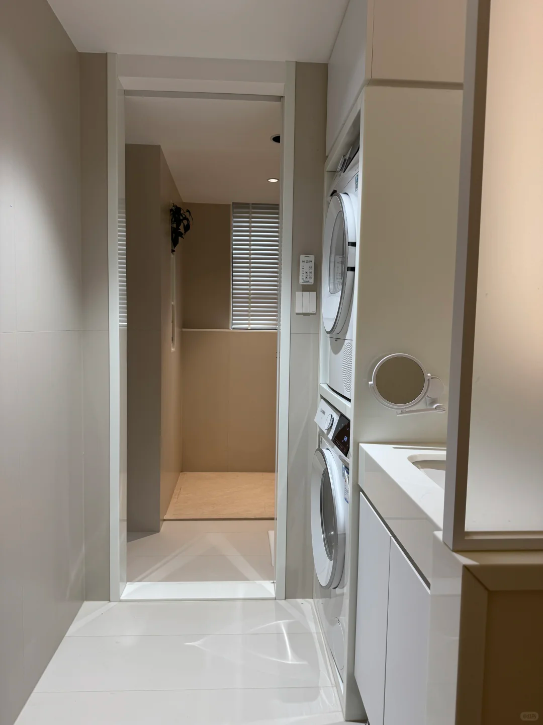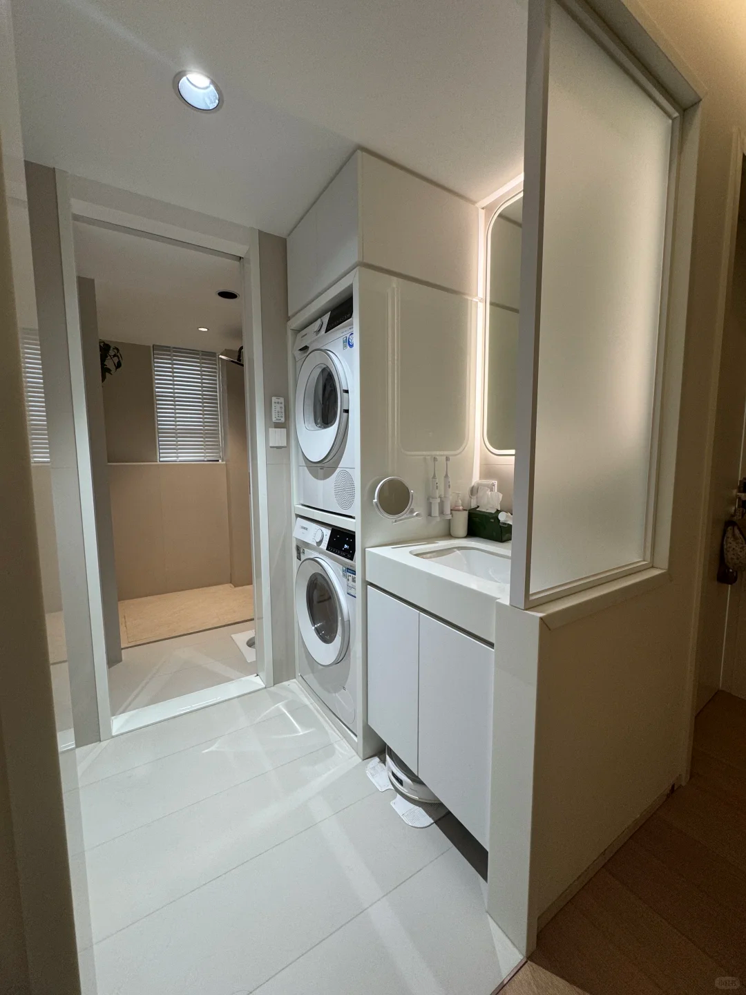 网友@一一 的分享:我把洗衣机烘干机都放在卫生间的手盆旁边了,我觉得卫生间是最适合洗衣服的位置,已经住了两年了,安利给大家,真的非常方便好用。
